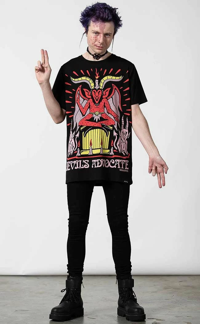 Get yer casual sin on in The Devil’s Advocate T-Shirt! Soft stretch cotton forms this regular fit tee, featuring a bold, statement print of Baphomet above the words “Devil’s Advocate”. Pair with jeans, shorts, leggings and yer rockin’ bod!
