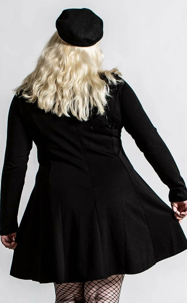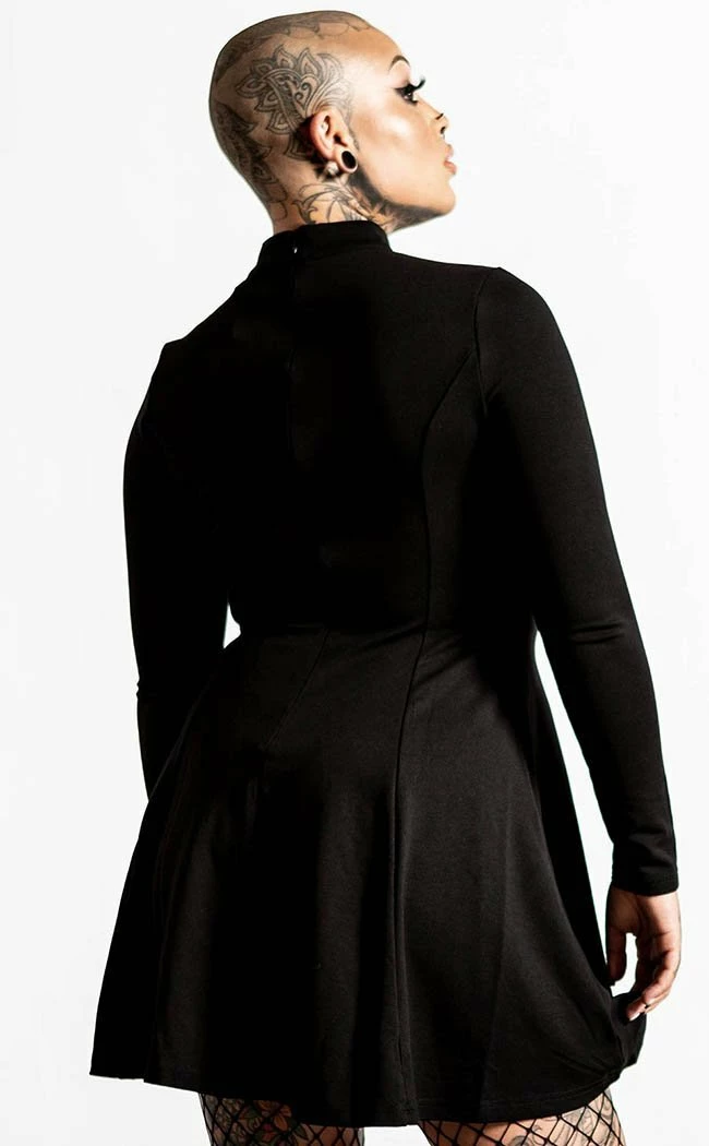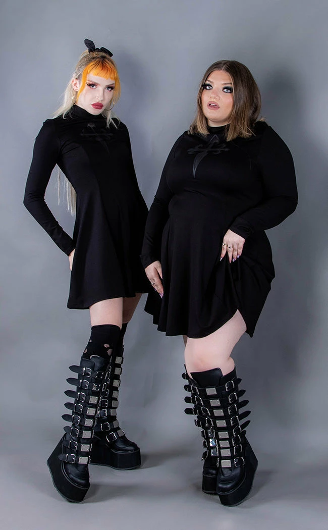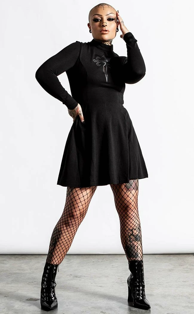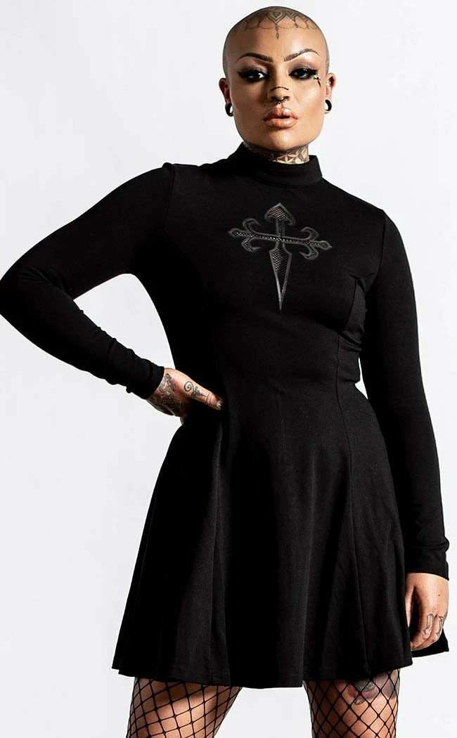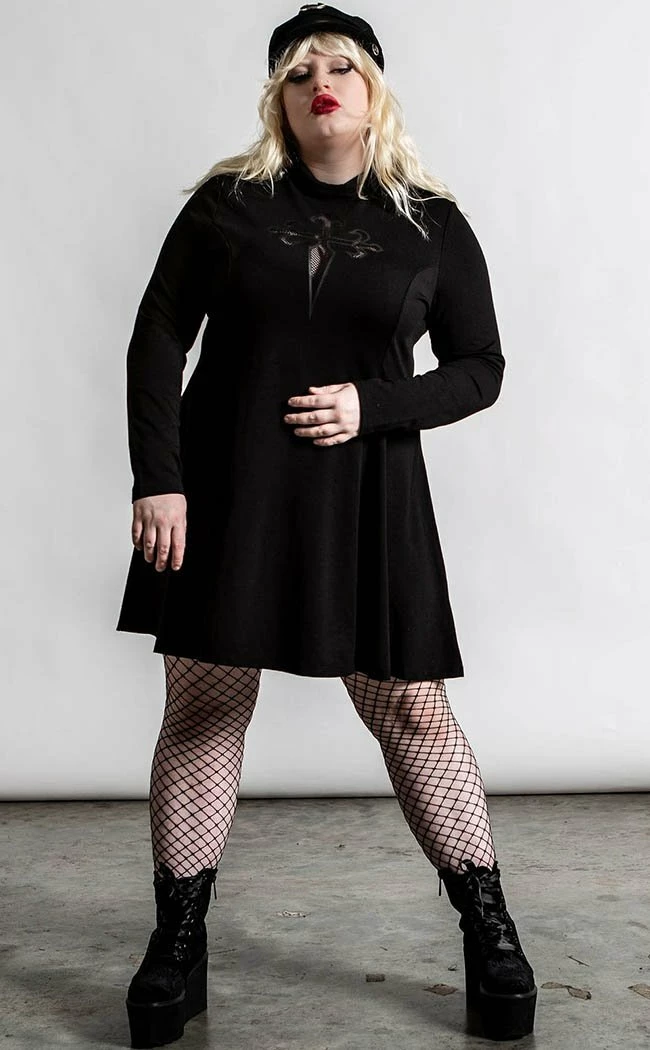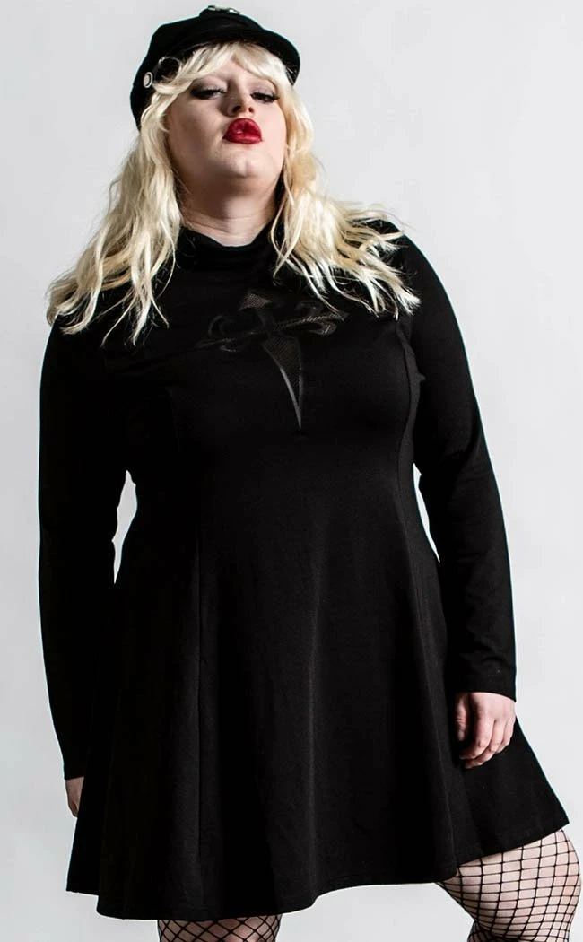 Host yer own black mass with the chic Evanna Cross dress! The woven stretch fabric clings to yer figure, flaring into a skater skirt at the fitted waist. The long sleeves and high neck keep the demons in and your body warm while the showstopping cross cutout is completed with a sexy mesh panel.