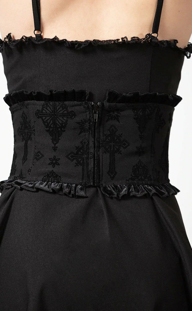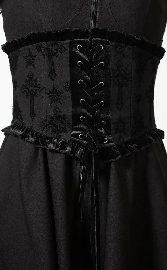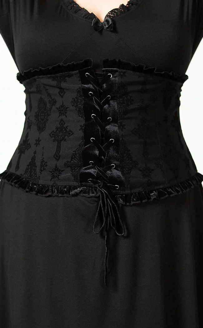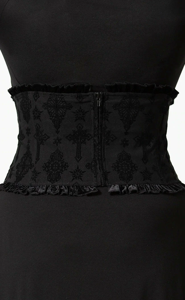 The Flix Flocked Waspie is the outfit finisher for flirty vamps and studious witches! This structured waspie is made with soft stretchy fabric flocked with a statement pattern and trimmed with ruffles, contouring comfortably to yer body while the structured design provides support. You can tight lace with an adjustable lace-up panel at the front but slip it on and off in a snap with a zip at the rear.