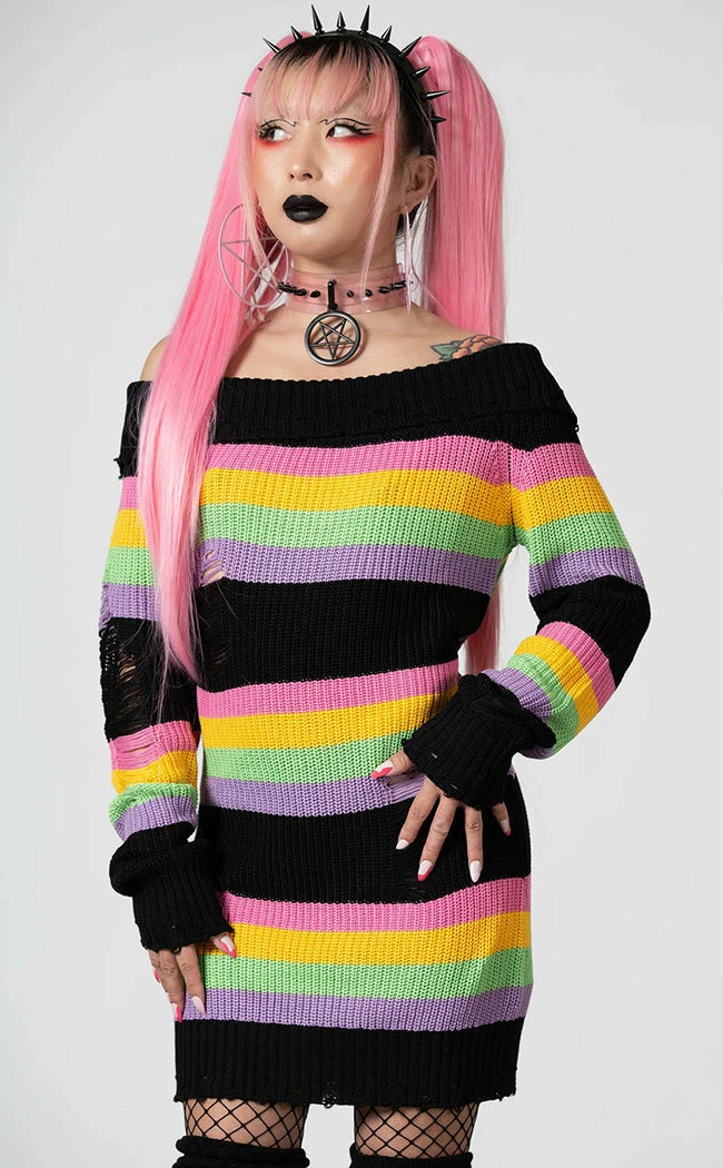 Fill your life with colour and good vibes only! The Good Vibes Sweater Dress is the cosiest statement piece around,Β conjured from a soft, stretch-knit that forms this off-shoulder, long-sleeved mini dress. Bold stripes of colour mean you can match this baby with yer fave pastel accessories or simply pair it with cosy black knee-high socks for an effortless comfy casual lewk.