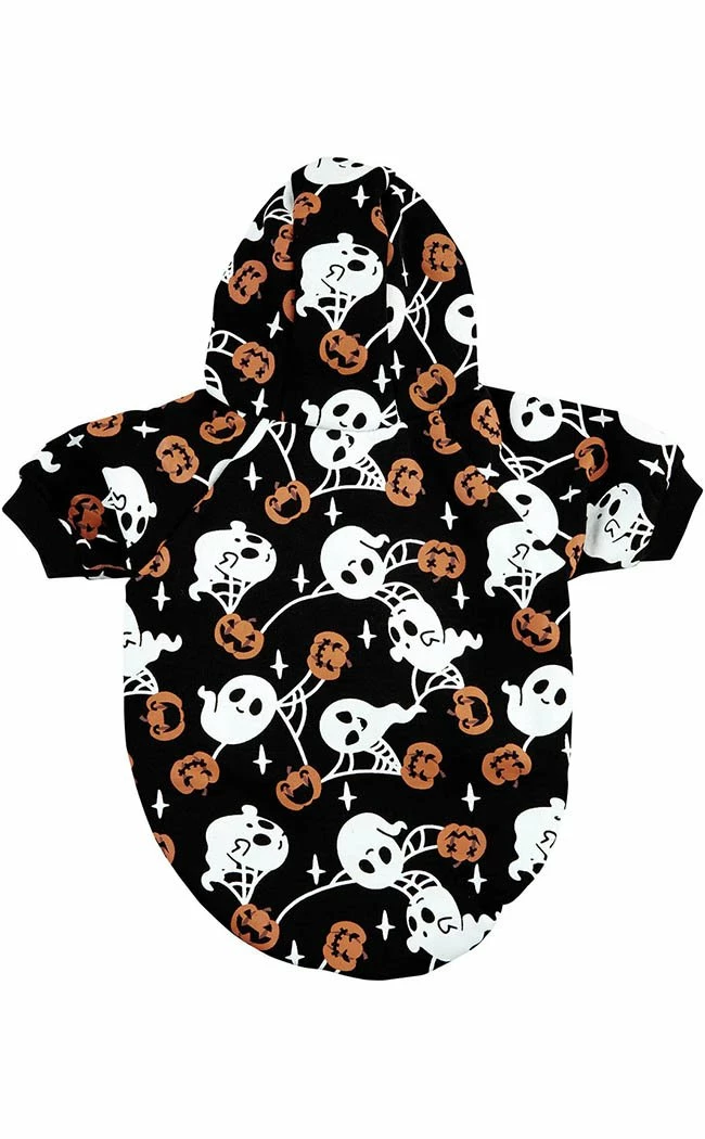 Keep your furbaby warm and Halloween ready with the Haunted Pumpkin Pet Hoodie. Made of super-soft jersey, this little outfit features a large hood, a vibrant spooky print and sleeves for the front legs. The hoodie secures with press studs for no stress on/off.