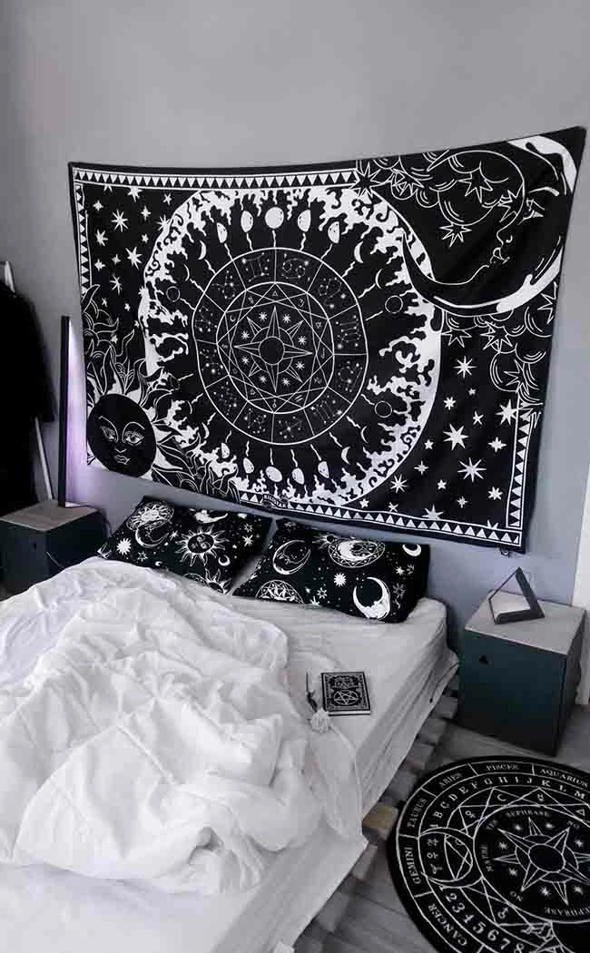Decorate yer crypt in style with this ethereal tapestry; the ‘Heavens’ is complete with a large contrasting print on black soft touch fabric, featuring all 12 star signs and contrasting moon + sun design. Perfect above yer bed, couch or wherever yer dark heart desires!