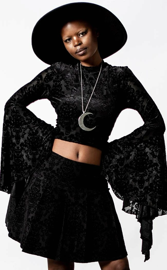 Watch a glorious rebirth in burnoutΒ velvet and drama!Β The Incarnate Lace Up top is a high neck crop that’s fitted to your gorgeous bod.Β The long sleeves flare into a dramatic waterfall so you can look extra magical when casting yer hexes.Β The rear features a lace-up detail for extra retro sexiness.