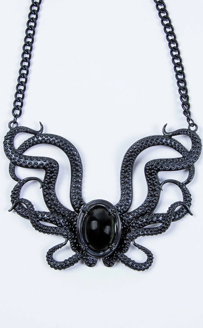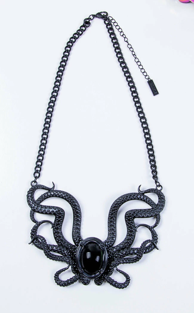 Wade in the dark & the deep with the Ursula Necklace! This oversized pendant features a shining black gem surrounded by tentacles, finished in shining black. The tentacles have a small hinge behind the oval pendant, allowing the necklace to sit naturally on your neck.