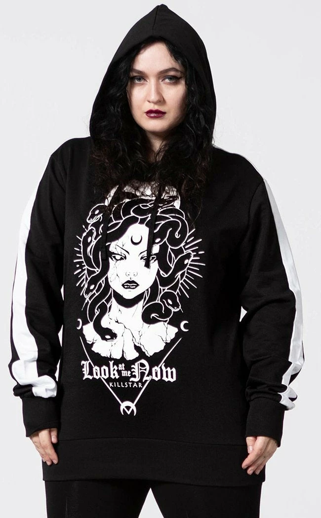 Serve stony-faced lewks in the Medusa Hoodie! Get yer sporty gorgon on with athletic stripes on the long sleeves & ribbed cuffs. The hood is super slouchy and the body is super relaxed for the days where you don’t want people to know if you’re human underneath. The contrast print is wicked cool so you can keep it casual while still serving stone-cold looks!