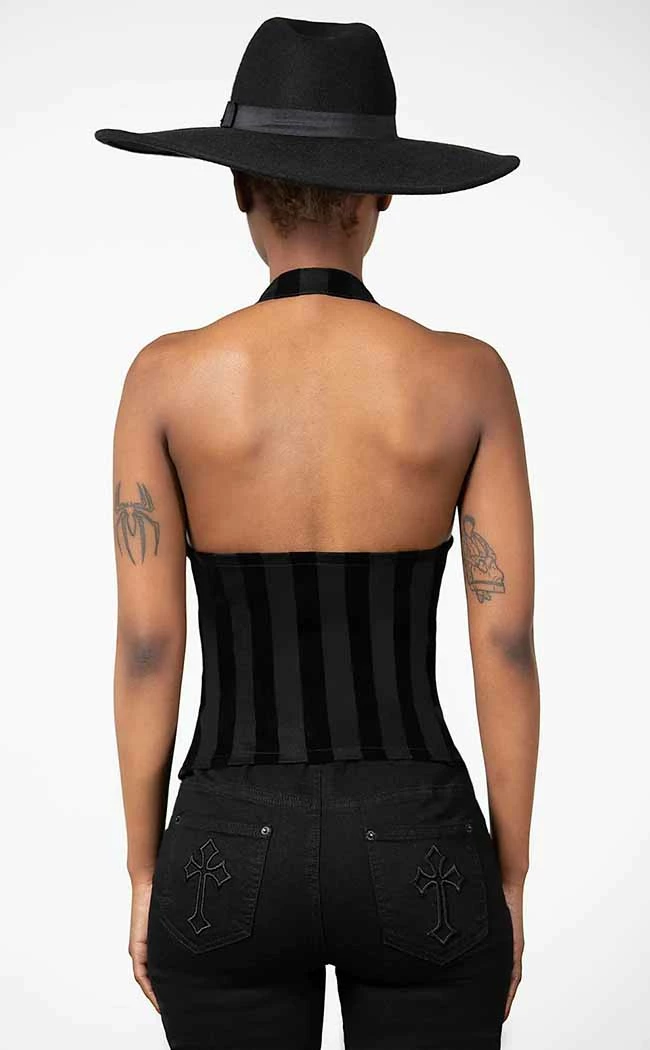 Snatch the competition in the Merciless Halter Top! Striped flocked denim forms this statement halter top, featuring structured, underwired cups, adjustable halter straps and a full zip front with a decorative cross pull.