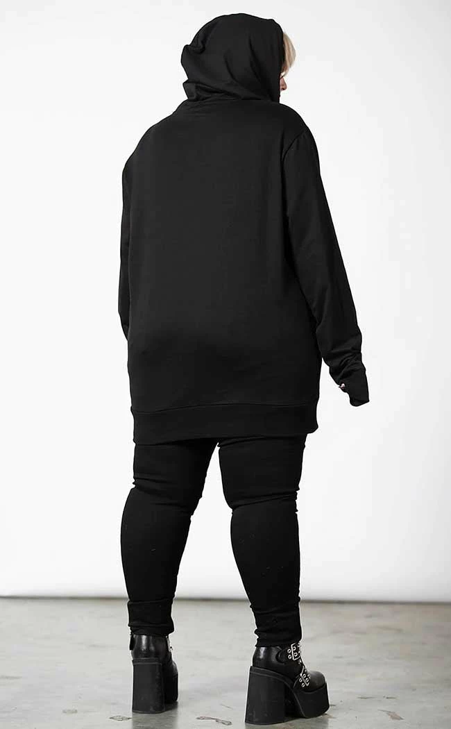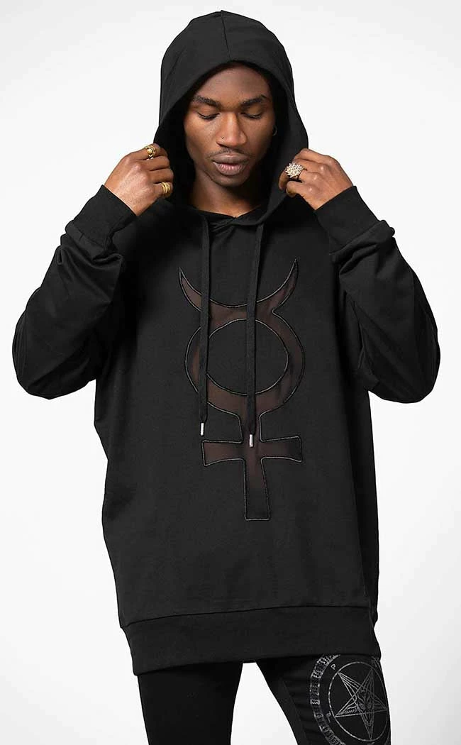 Look stellar and wicked in the Mercury Rising hoodie! This relaxed pullover features a Mercury symbol mesh cutout on the front, an oversized hood and a long length so you can size up for hoodie-dress goodness.Β