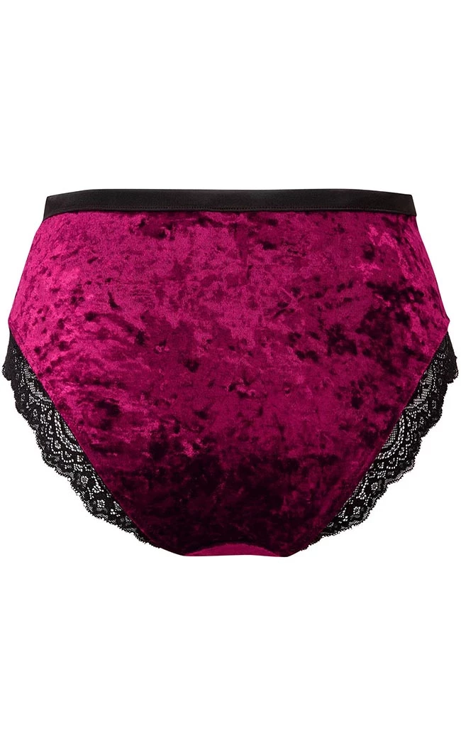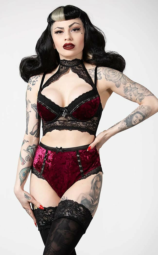 Dress to possess in the Mercy Lace Panty! Let the soft stretch velvet hug your body, trimmed with black lace and metal rivets for a touch of danger. Perfect for seductive ensembles or sleepovers with the coven.