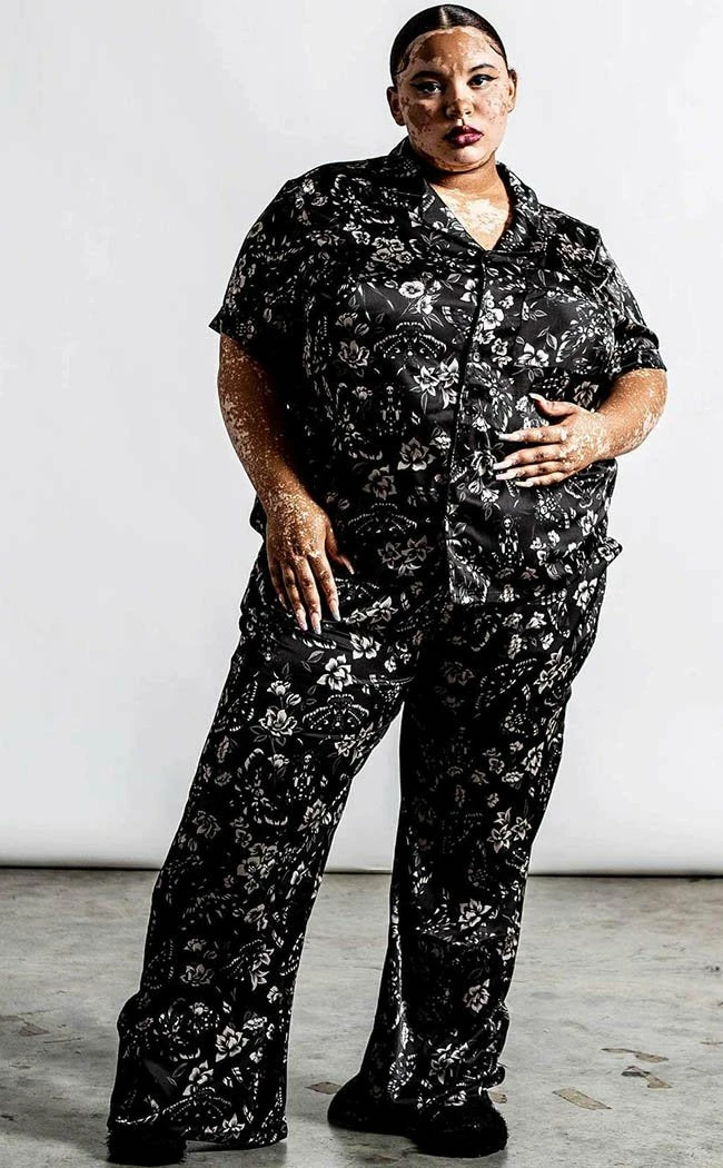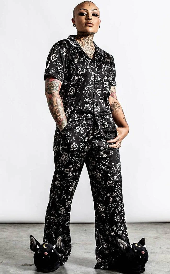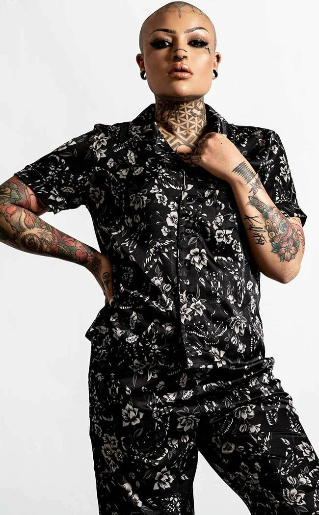 Stay up past the witching hour in the No Rest for the Wicked PJ set! Featuring a short-sleeve shirt and long pants, both pieces are made with super soft satin in a relaxed fit that will have you screaming for joy. The beautiful print of moths and flowers will have you laying in a garden of dark desires, the best bed for sultry dreams and back support.