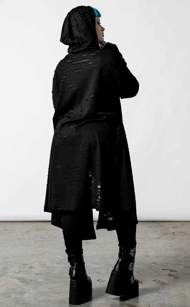 Get shrouded and shredded in the Nu-Dawn Hooded Cardigan! This statement cardi is made of super-soft, shredded fabric that features an oversized hood, an open front and a super comfy relaxed fit.