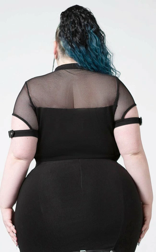 Throw out yer old basics and make way for yer new staple top! The Parish Mesh top features a mesh yoke and sleeves with cutout details and straps. The material is super soft and stretchy, perfect for summer goth lewks.