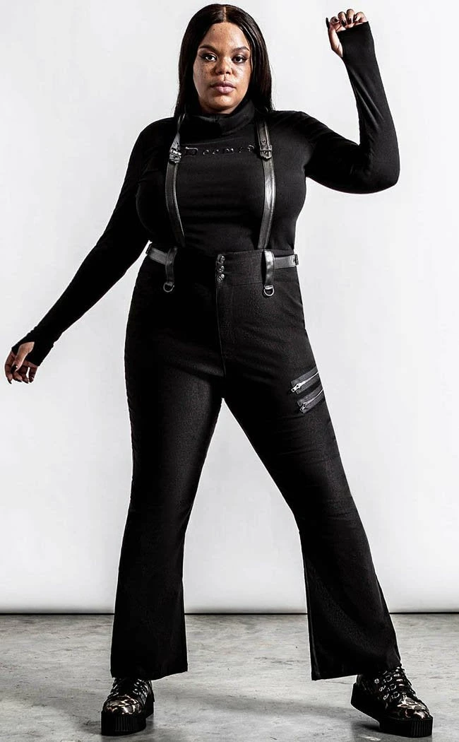 These kickass trousers bring some 70s chic to the punk scene: with a high waist and flared legs, the retro vibes are topped off with faux leather straps and belt accents. The pants have a zip closure and the fabric is soft n stretchy to keep you throwing hands day and night.