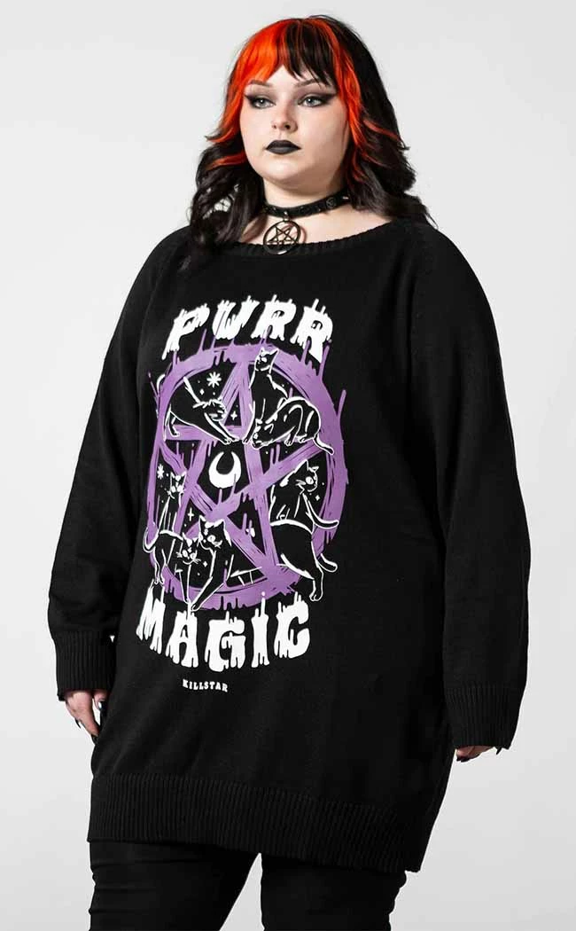 Snuggle up in kitty style with the Purr Magic Knit Sweater! This soft, longline knit features long af sleeves and aΒ wide neckline. The front is printed with a magickal contrasting motif of a pentagram surrounded by kitties and the words “Purr Magic”.