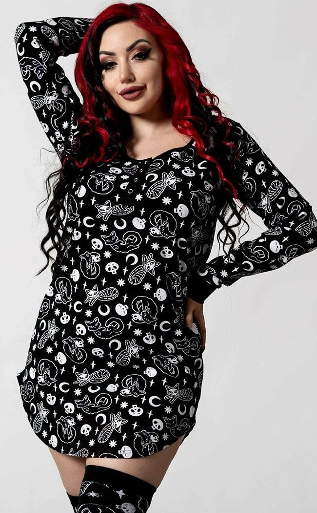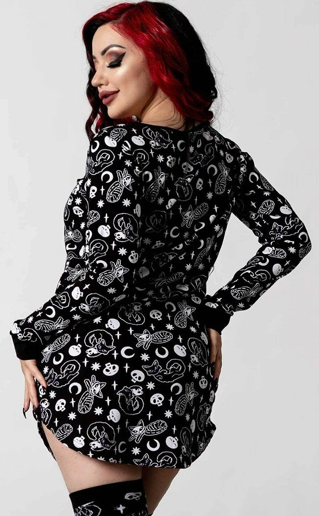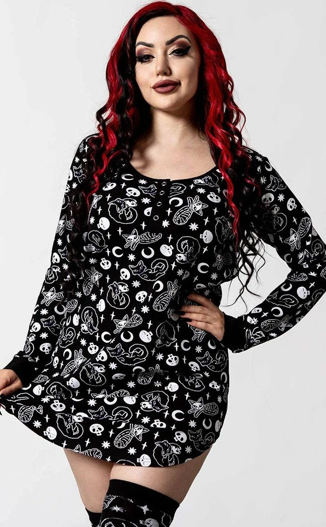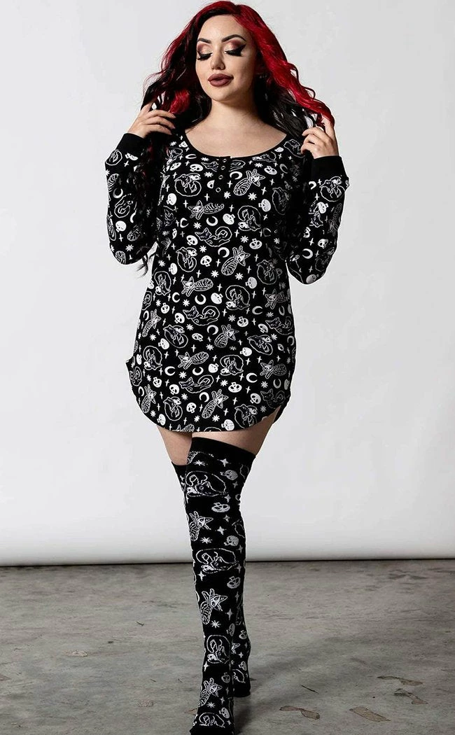 Curl up for a snooze with adorable kitties in the Purr Off sleep dress.Β Β The fabric is soft af and covered in a contrasting pattern with occult imagery.Β The dress has long sleeves and a round neckline, perfect for summer as well as winter!