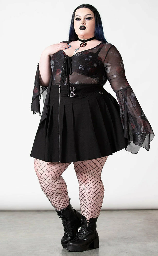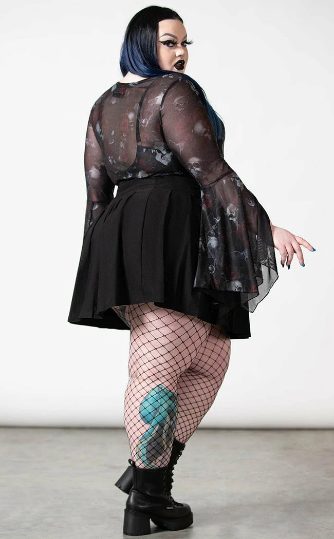 Lay yerself down in a bed of roses! TheΒ Rosaella Mesh BodysuitΒ will have you feeling like a vampire seductress;Β made from super stretch mesh printed with a wicked motif of roses, skulls and bats. The mesh forms a deep V neckline, a lace-up chest, dramatic bell sleeves and a lined gusset.