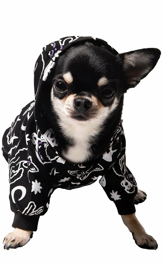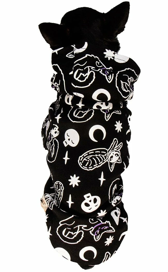 Keep your furbaby warm with spooky kitty friends in the Purr Off Hoodie!Β Made of super-soft jersey, this little outfit features a large hood, aΒ vibrant spooky print and sleeves for the front legs.Β The hoodie secures with press studs for no stress on/off.