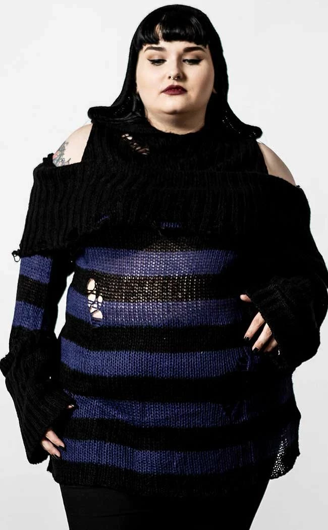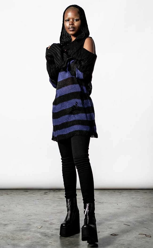 Get snug inΒ inky stripes with the Sapphire Hooded Knit Sweater. Super soft and totally vegan, this knit wraps you in a statement bardot neckline and cosy hood. TheΒ blue and black stripes feature shredded details to get ya feeling extra badass, fitting over yer bod in effortless warmth and style.Β
