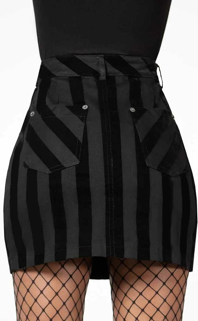 Add a playful touch to yer corpgoth fits in the Scallywag Mini Skirt! Striped, flocked denim forms this classic mini silhouetteΒ that fits snug to yer bod with a high waist. Extra trims like belt loops, back pockets, decorative zips and a full-length zip and double button closure complete the piece.