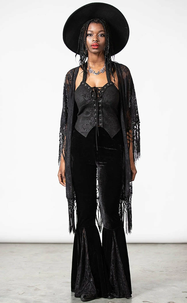 Wrap yourself in shadows with the Witch Hazel Lace Kimono! Soft and sheer lace forms this relaxed fit kimono, featuring floral patterningΒ and tassel hems.