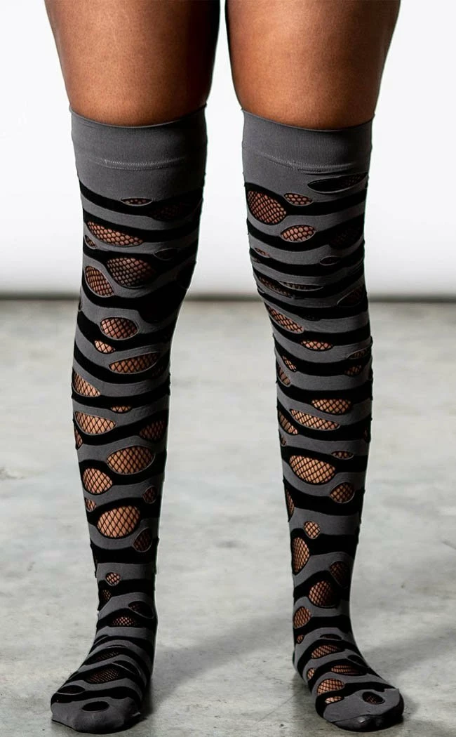 How’s this for a super-easy way to add an edge of shred to yer outfit? These thigh highs feature a striped, distressed outer layer with fishnets underneath. Â