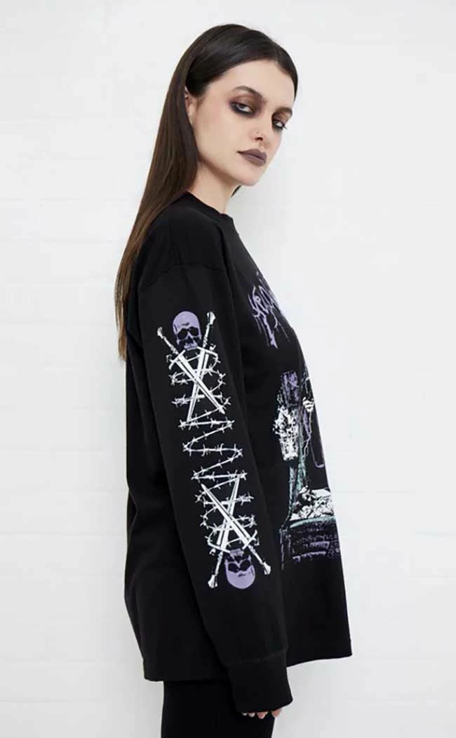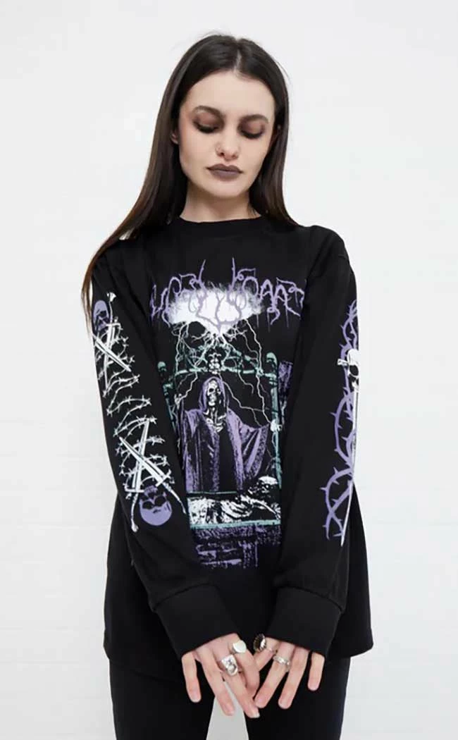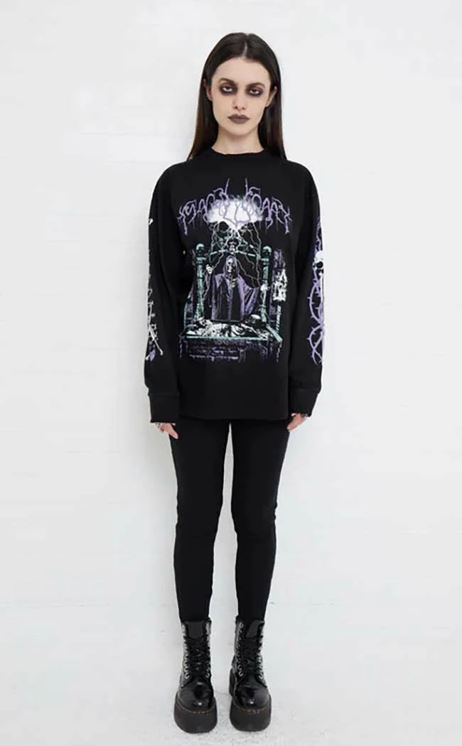 The Crypt Wizard Long Sleeve Tee will have you feeling powerful yet cosy. Durable, soft cotton forms a crew neck and relaxed fit tee which features an oversized print of metal font and artwork in muted purple and green.
