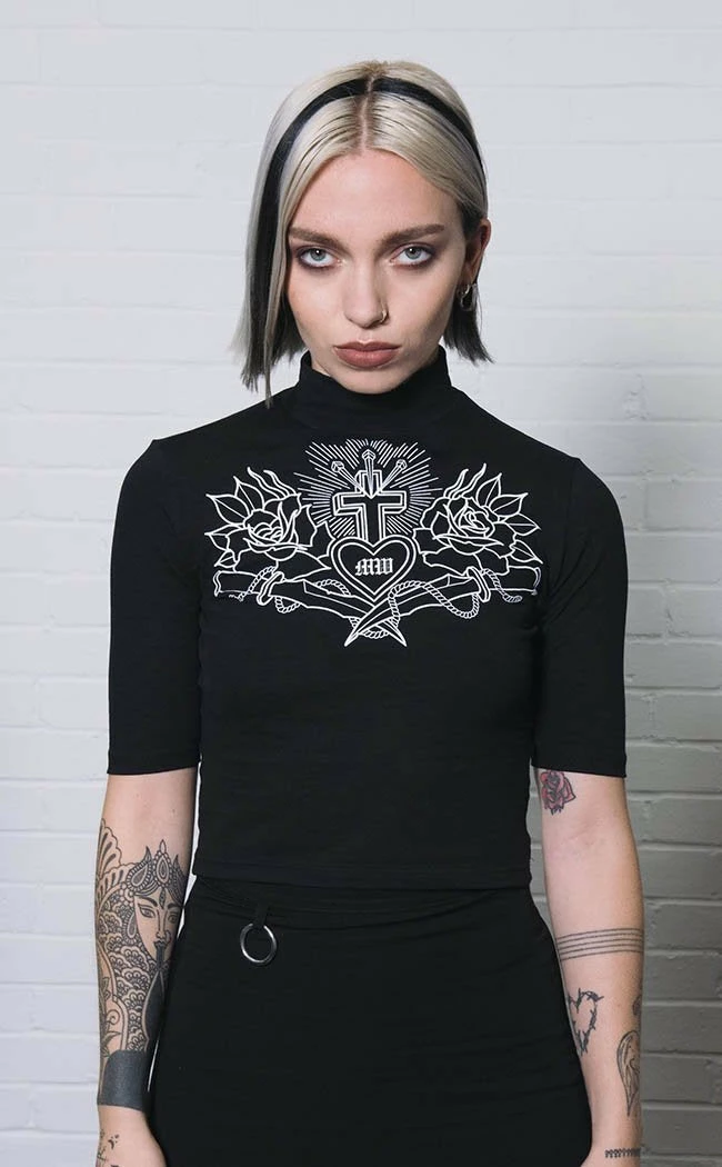 This Mary Wyatt signature crop sets itself apart with an exclusive art print by world famous artistΒ Scott Move!Β Roses and daggers sit before a cross, radiating vibes of defiance and perhaps a little violence.