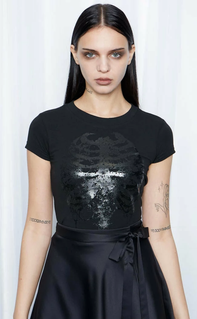 Beaty isn’t skin deep with the Corpus 90s Crop Tee. Show off yer bones with a glossy black-on-black print, sitting centre stage on a flattering crew neck tee. The crop sits just above the natural waist, perfect for waiting with high and low waist bottoms.