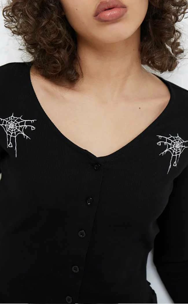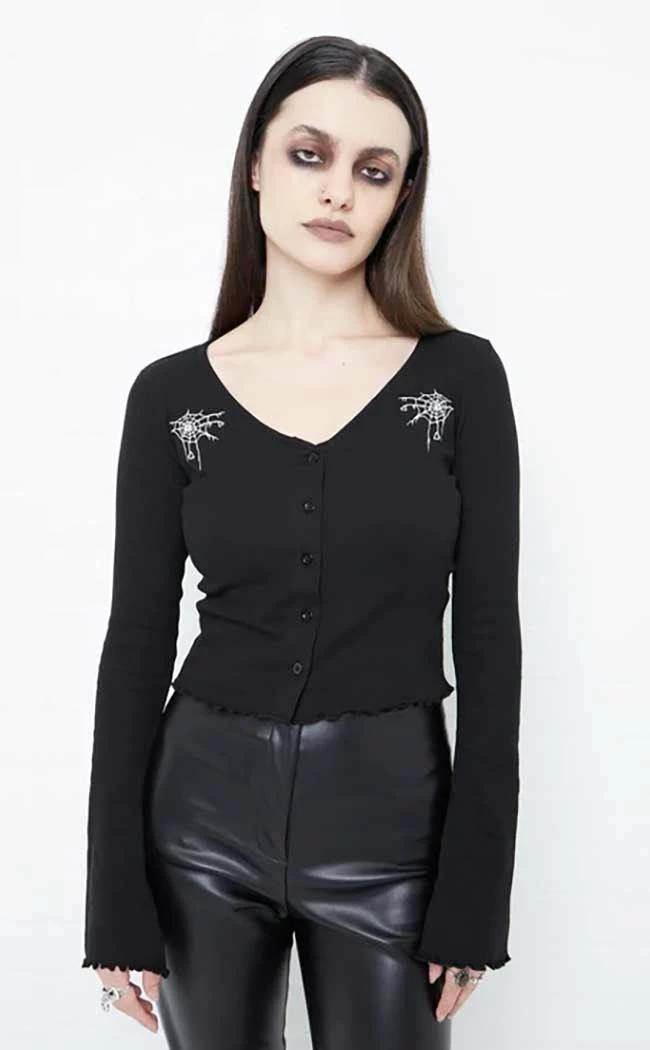 Create yer dream grunge looks with the Cynthia Cardigan!Β A lightweight cotton rib forms this cute cardi, featuring a deep v neck, a button-up front and lettuce-edge frill on the sleeves and hem that sits just below the natural waist. Two spiderweb motifs are embroidered on the front while the back features a cute zombie bear print.