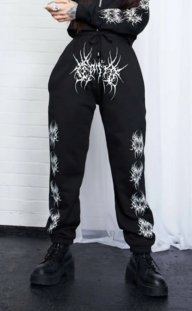 Bring out yer inner rebel in the Nephilim Sweatpants! Made with heavy fleece-backed cotton, you’ll be snug and warm all winter long in the slouchy fit. The word “Ecstasy” is printed on the front in a metal font while brutal motifs are printed down the legs. The pants secure with a drawstring and wide elastic bands on the waist and ankles for a comfortable fit.