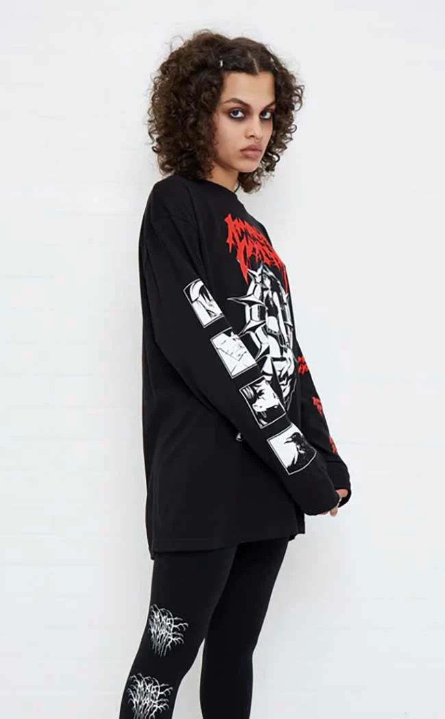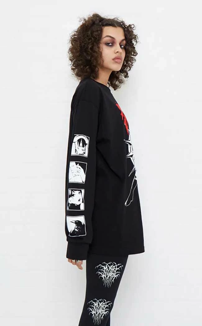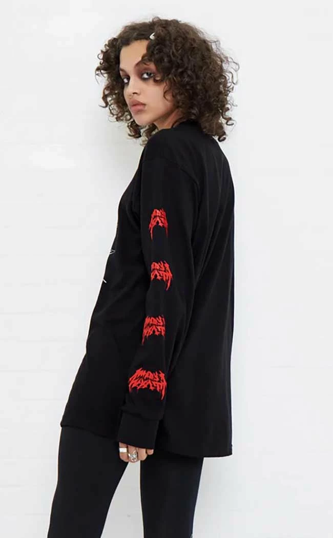 The Ren Long Sleeve Tee is the best combo of cute n evil! Warm, soft cotton forms this relaxed fit tee, decorated with a statement white and red print on the chest and sleeves.