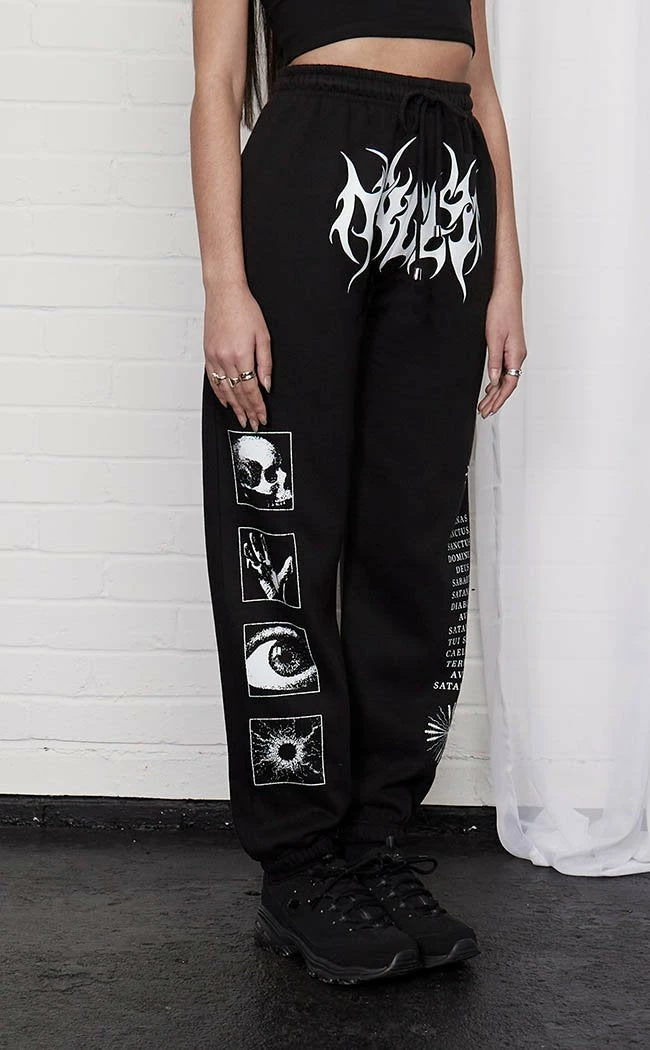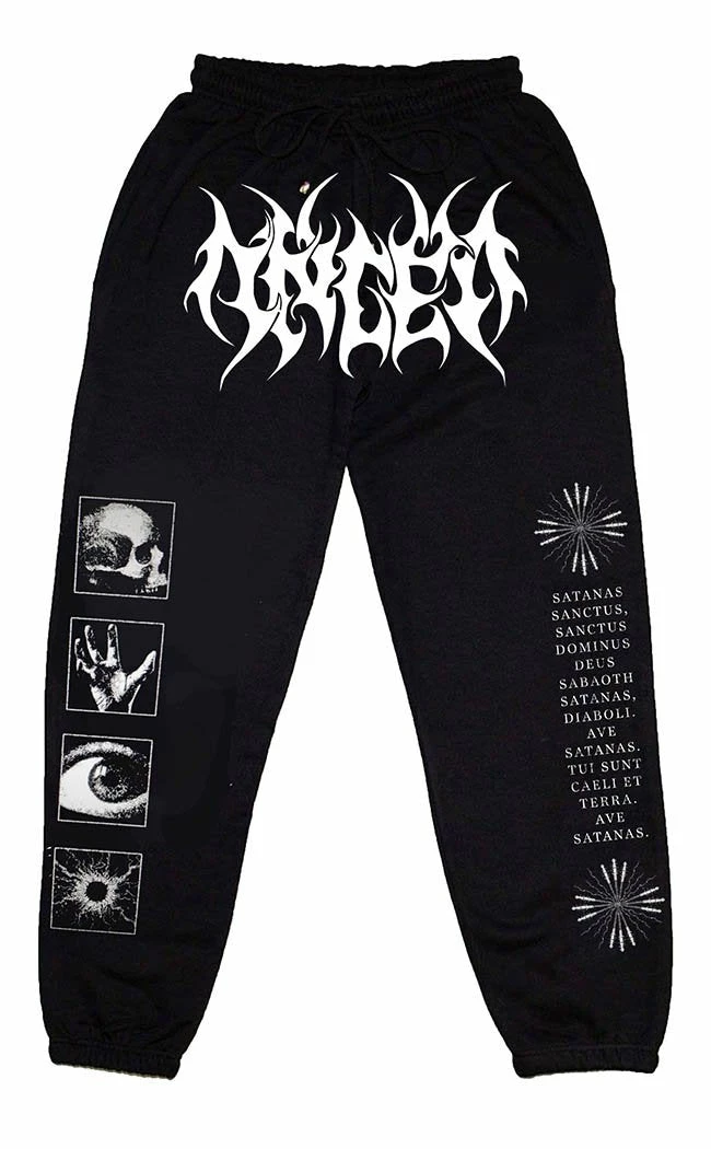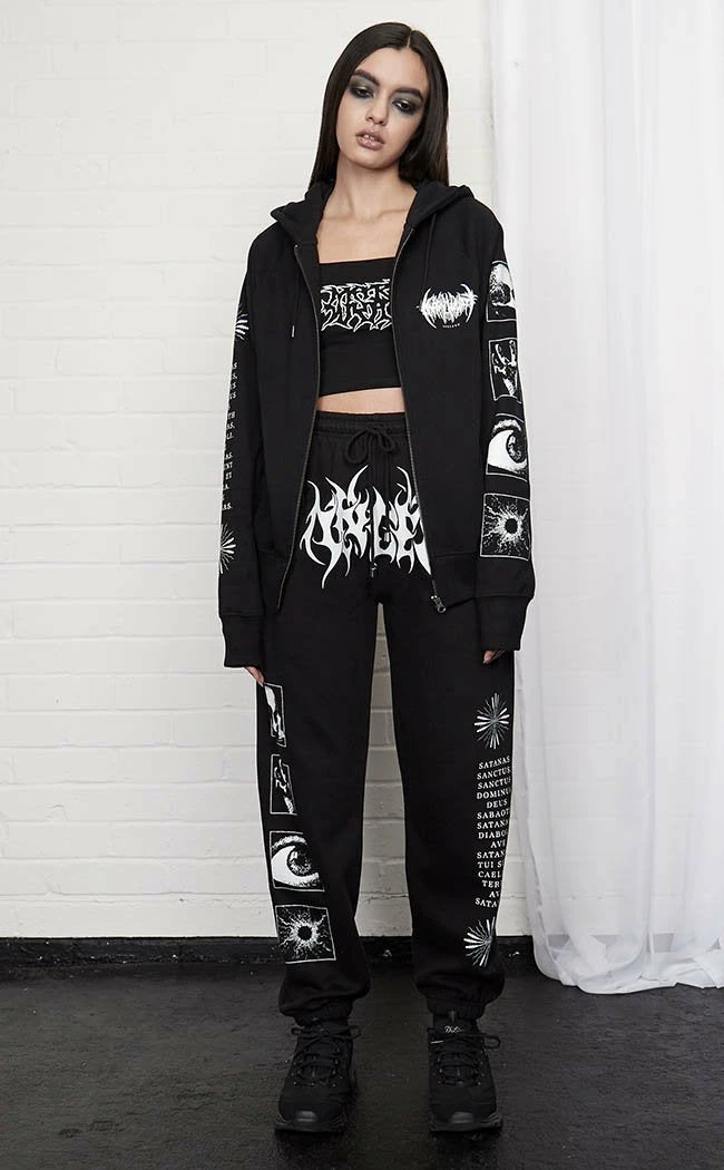 These cosy fleece sweat pants gather at the waist and ankles for a slouchy fit.Β Black metal font cuts into the front while morbid artwork and grim Latin phrases snake down the legs.