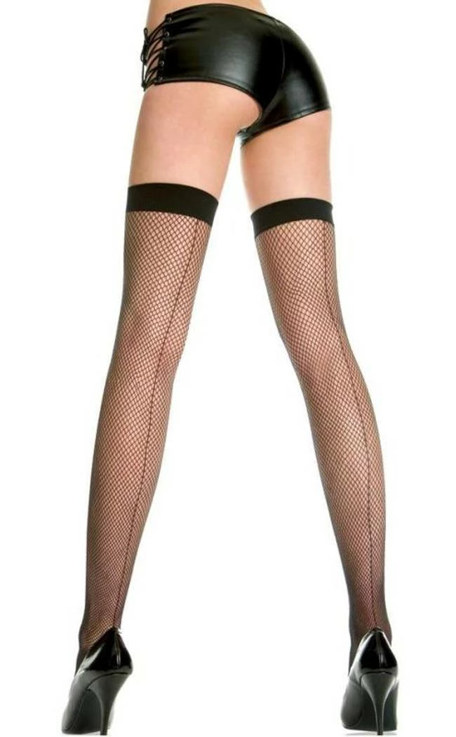 Music Legs Nylon Thigh High Fishnet Stockings with Retro back seam in Black.