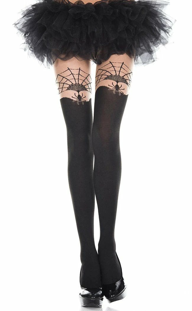 Faux garter tights for black widows!Β These full pantyhoseΒ seem like thigh highs with none of the need for garters, a black spider hanging down from her fan web to hold up the black.