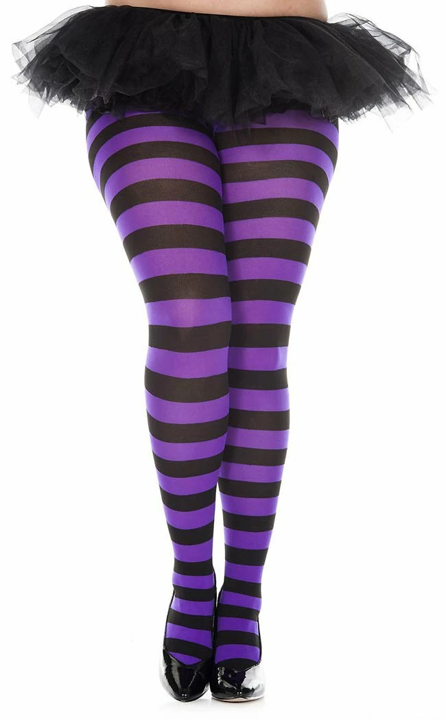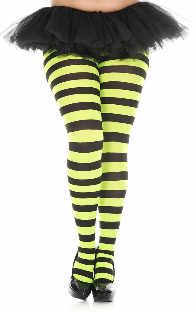 Stripy tights reminiscent of everyone’s favourite bioexorcist, perfect for Halloween or any outfit that needs a pop of classic monochrome style.