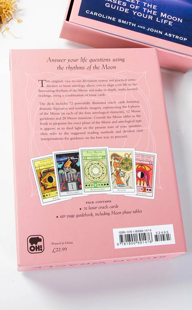 This introduction to lunar astrology allows you to seek guidance in tune with the moon and its cycles. The 72 illustrated cards include representations of the 8 moon phases, 12 moon goddesses and 28 moon mansions. Lay out different spreads and consult the included moon book toΒ pinpoint the exact phase of the moon and the astrological sign it appears in to contextualise the state of your question. Read on to discover suggested reading methods and advice on how to proceed.