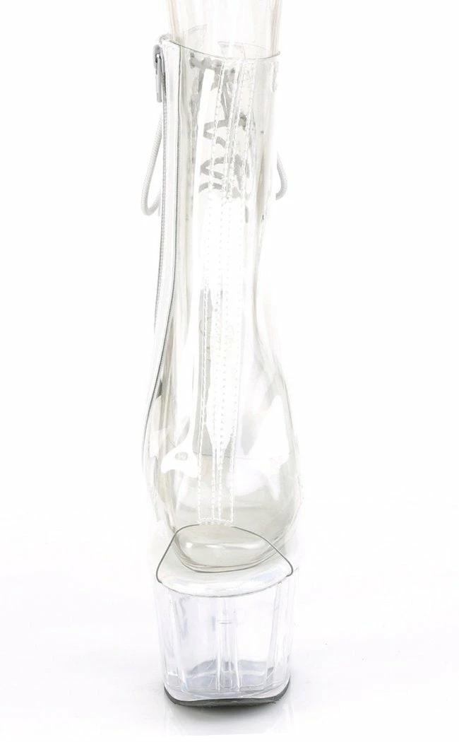 Adorable open-toe ankle booties: a clear upper atop aΒ clear platform with a chic lace-up back.