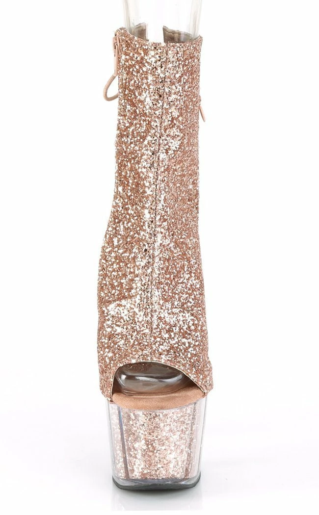 7″ (178mm) heel, 2 3/4″ (70mm) glitter inserted platform open toe/heel lace-up back ankle boot w/ hidden zip pocket, inside zip closure