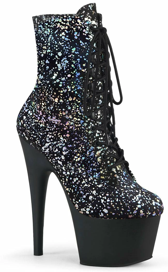 7″ (178mm) heel, 2 3/4″ (70mm) platform lace-up ankle boot featuringΒ holographic splatter print and inside zip closure