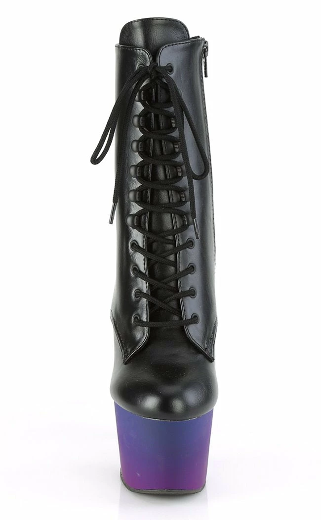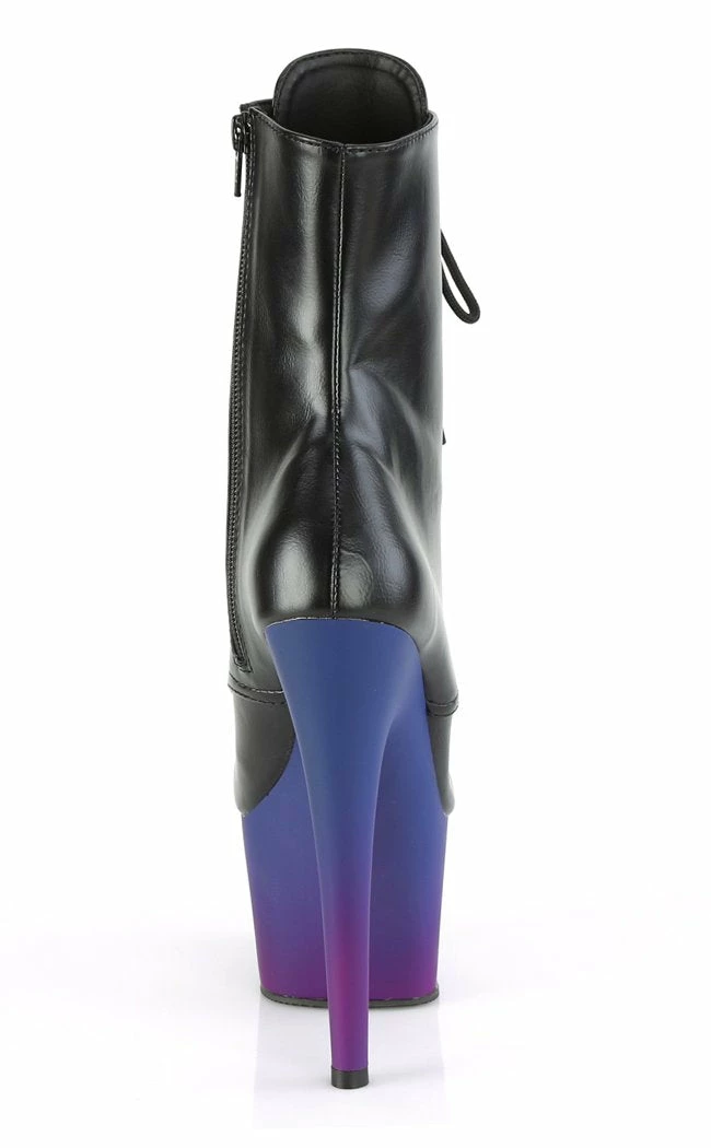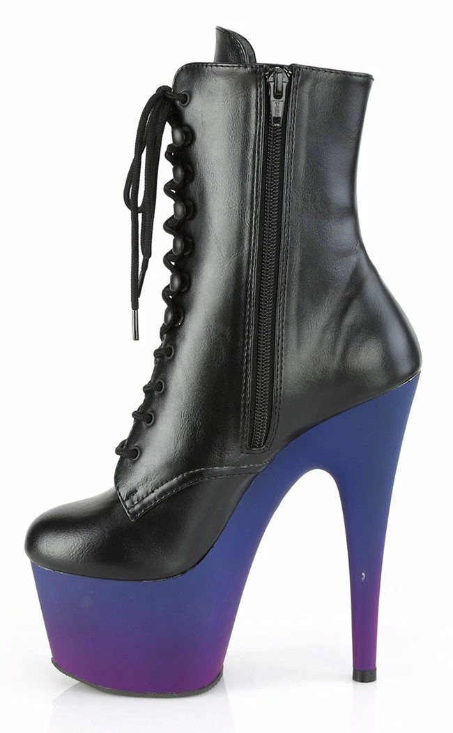 Matte black vegan leatherΒ platform booties with a lace-up front and awesome blue to purple ombre effect platform.Β Popular for pole and exotic dancers, these babies ooze sex appeal and glamour.Β