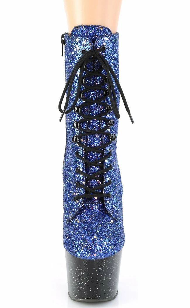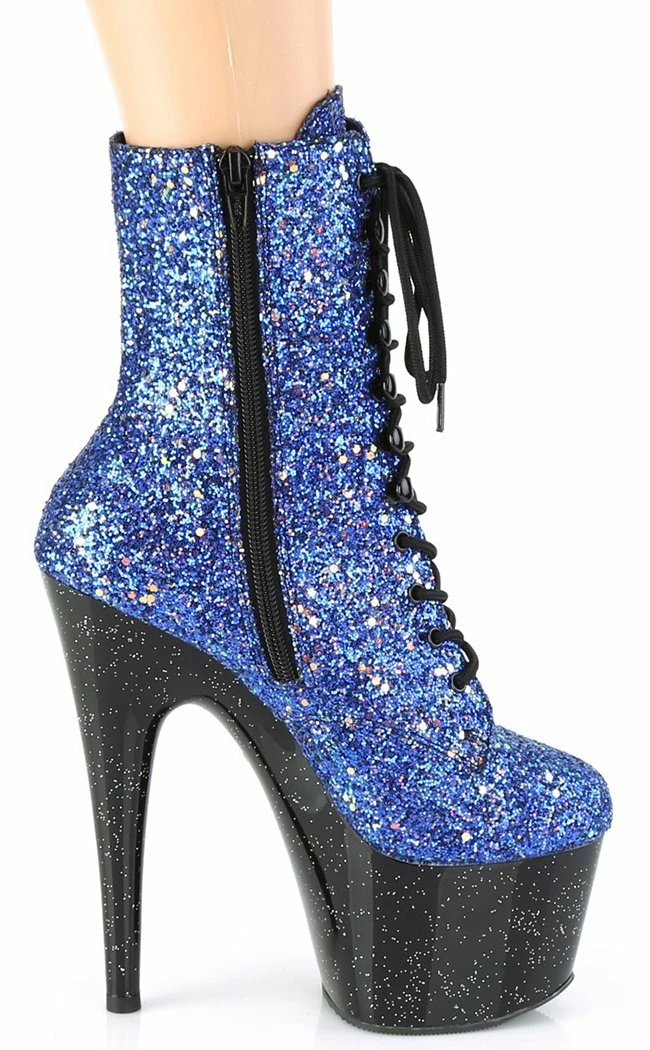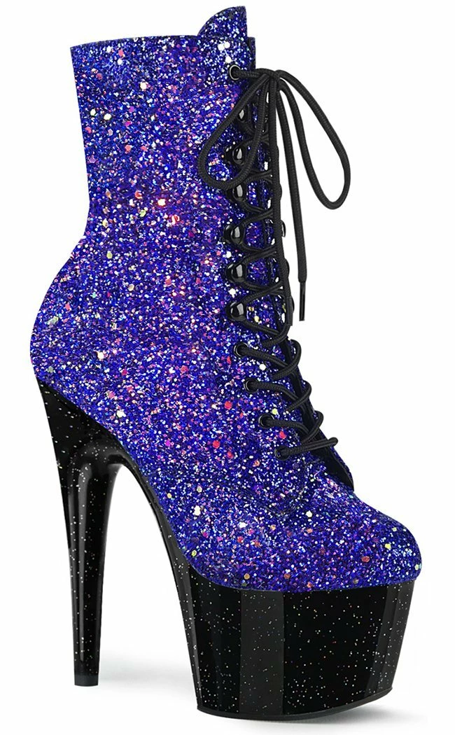 7″ (178mm) heel, 2 3/4″ (70mm) platform.Β Glitter upper with small iridescent glitter on entire platform.Β Inner zip closure.