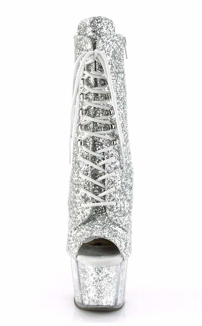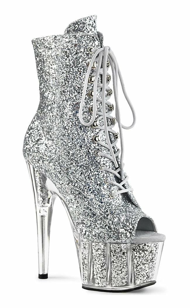 7″ (178mm) heel, 2 3/4″ (70mm) glitter filled platform lace-up front peep toe ankle boot, full inside zip closure.