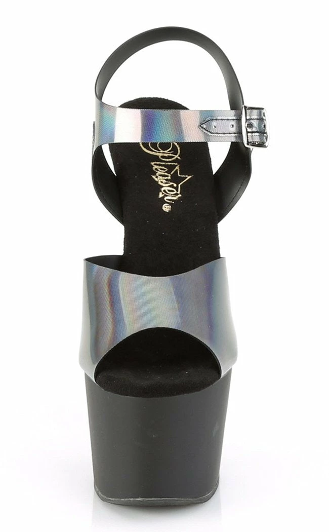 ShinyΒ pewter holographic platform heels with contrasting matte black platform.Β Popular for pole and exotic dancers, these babies ooze sex appeal and glamour.Β