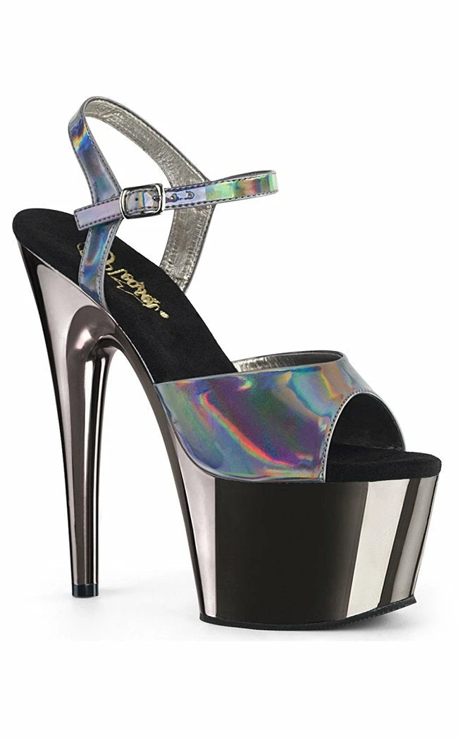 7″ (178mm) heel, 2 3/4″ (70mm) platform ankle strap sandal w/ chrome plated platform bottom