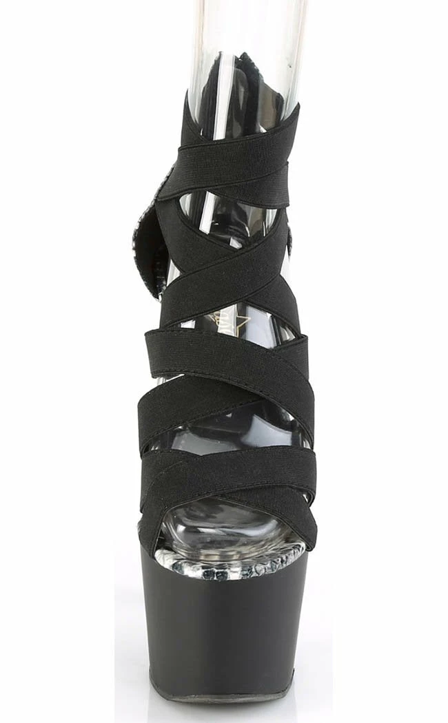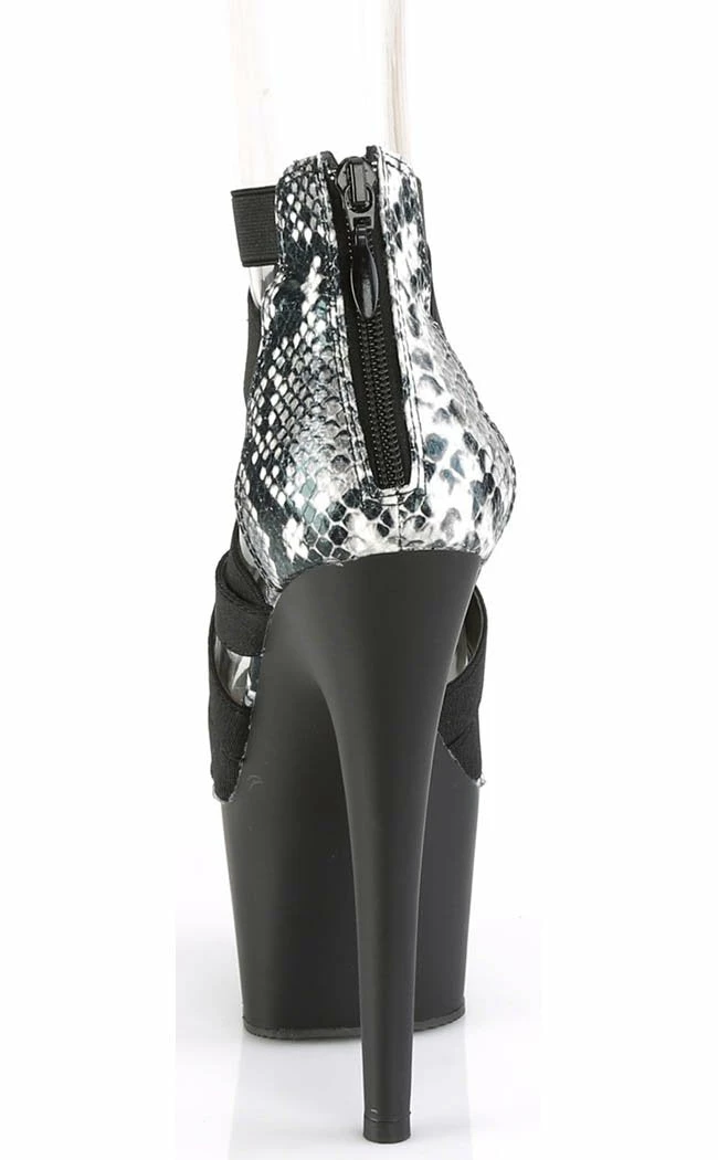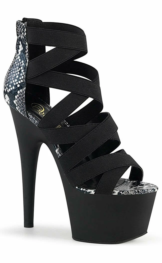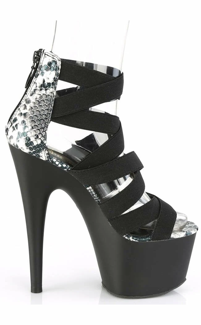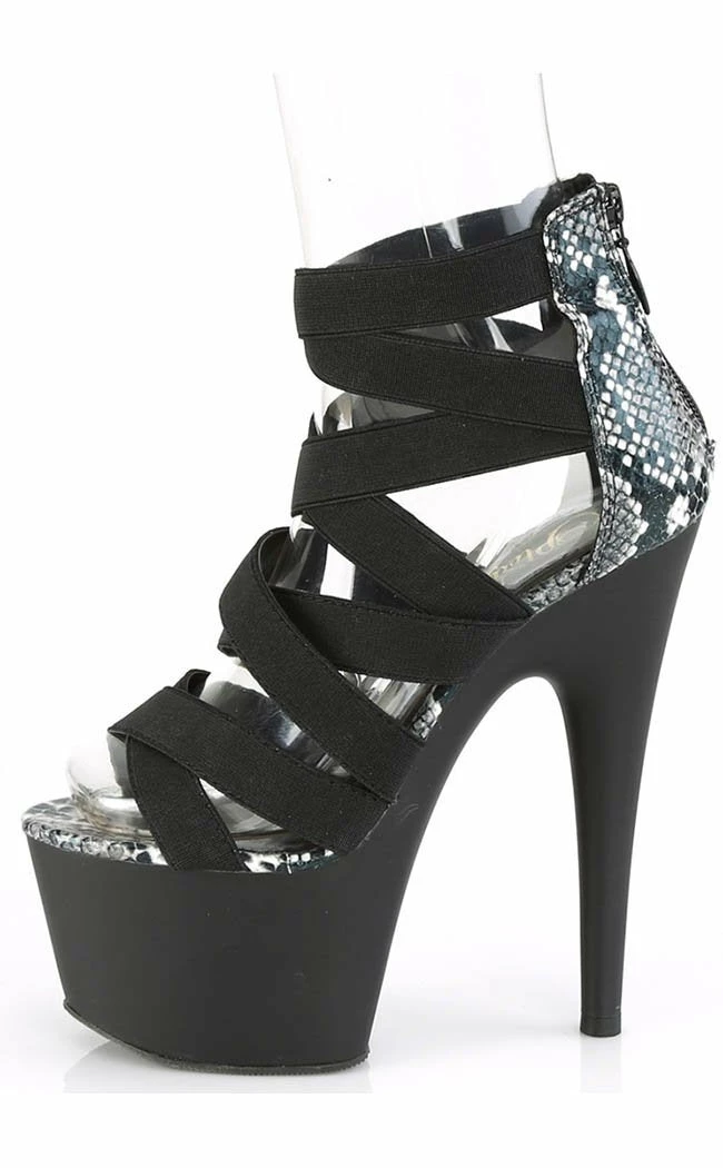 7″” (178mm) heel, 2 3/4″” (70mm) snake print platform with criss-crossing elastic straps.Β Β Rear zip closure