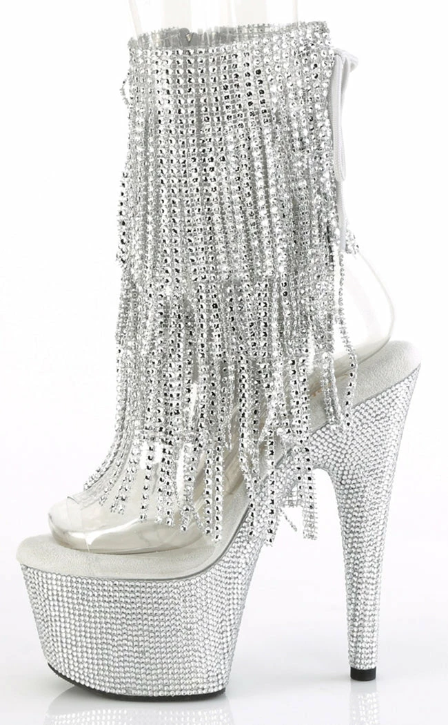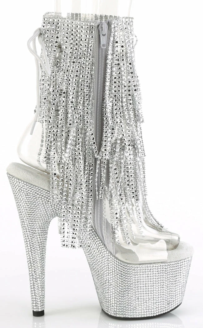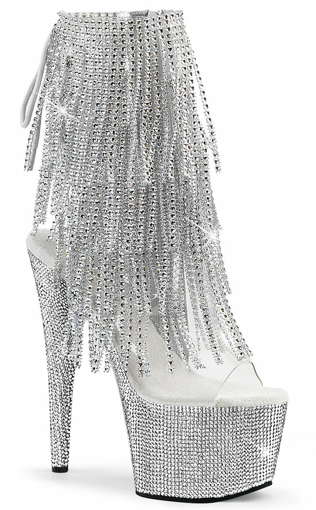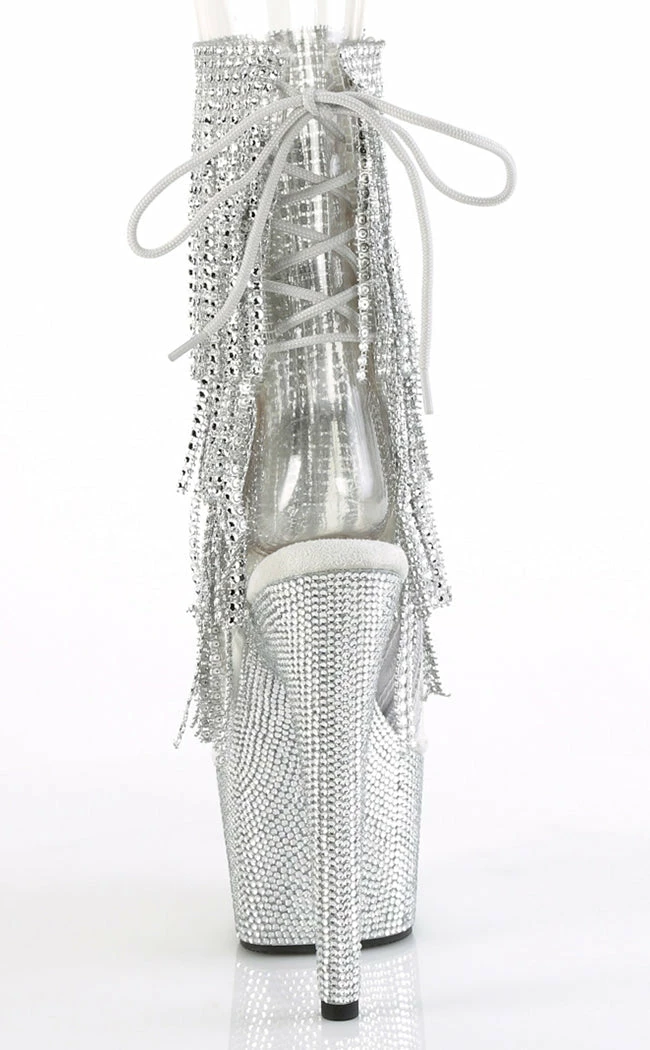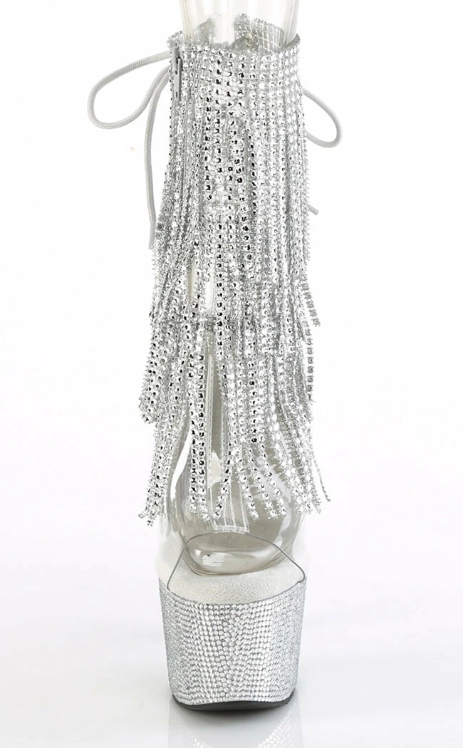 Time for a little glitter and shine! The luxurious BEJEWELLED-1017RSF-7 peep-toe boots feature a cutout heel and a platform totally encrusted with silver AB rhinestones. The upper features 4 fringe layers of silver rhinestones, lacing up at the back and securing with an inner zip.Β An absolute must for extravagant performances!