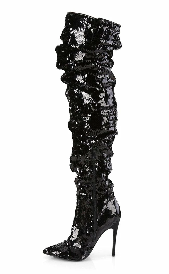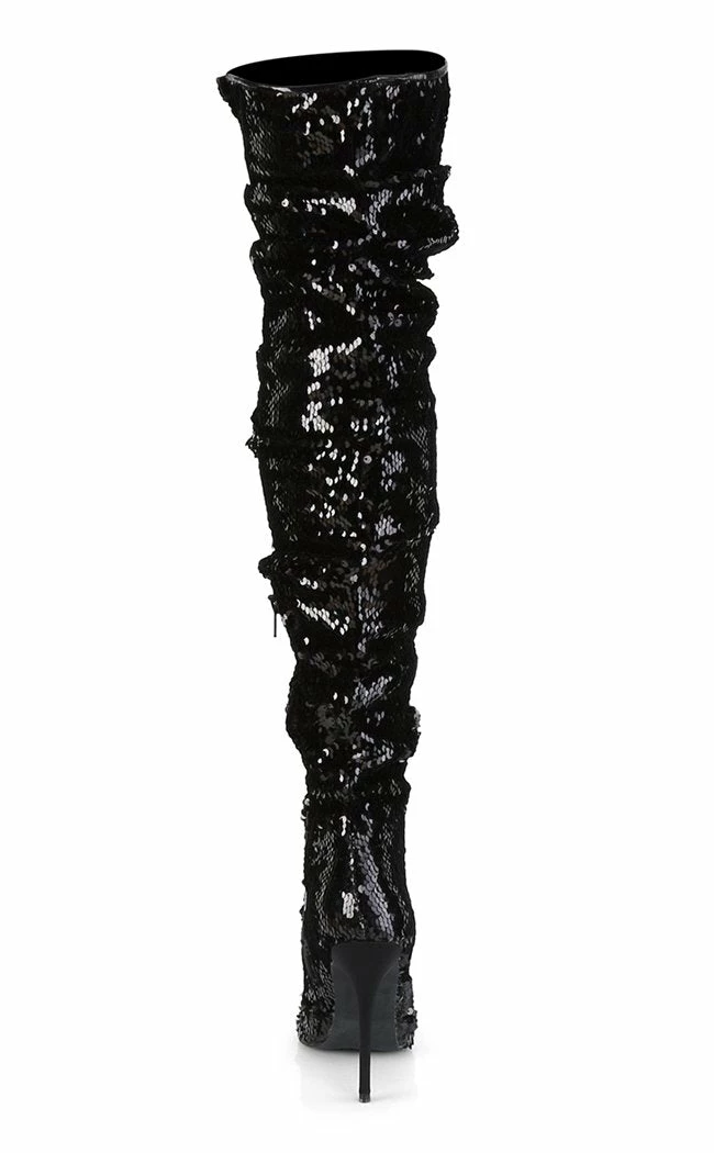 Glam black over-the-knee boot featuring ruched slouchy sequinned body, stiletto heel and single sole.