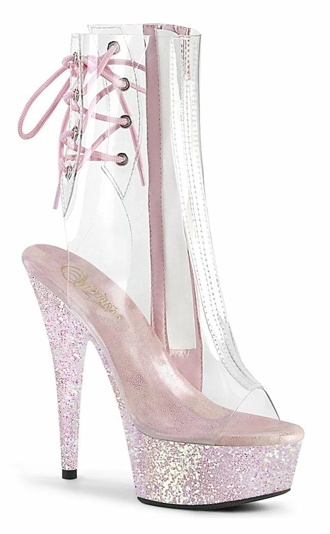 6″ (152mm) heel, 1 3/4″ (45mm) platform open toe/heel lace-up back ankle boot featuring holographic glitters on the entire platform bottom, full inside zip closure