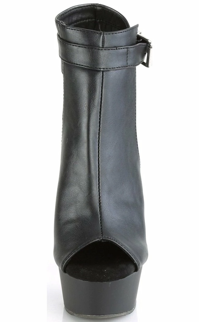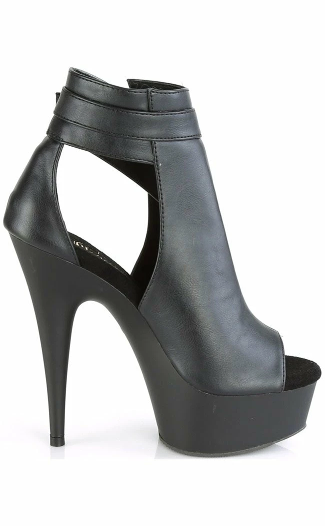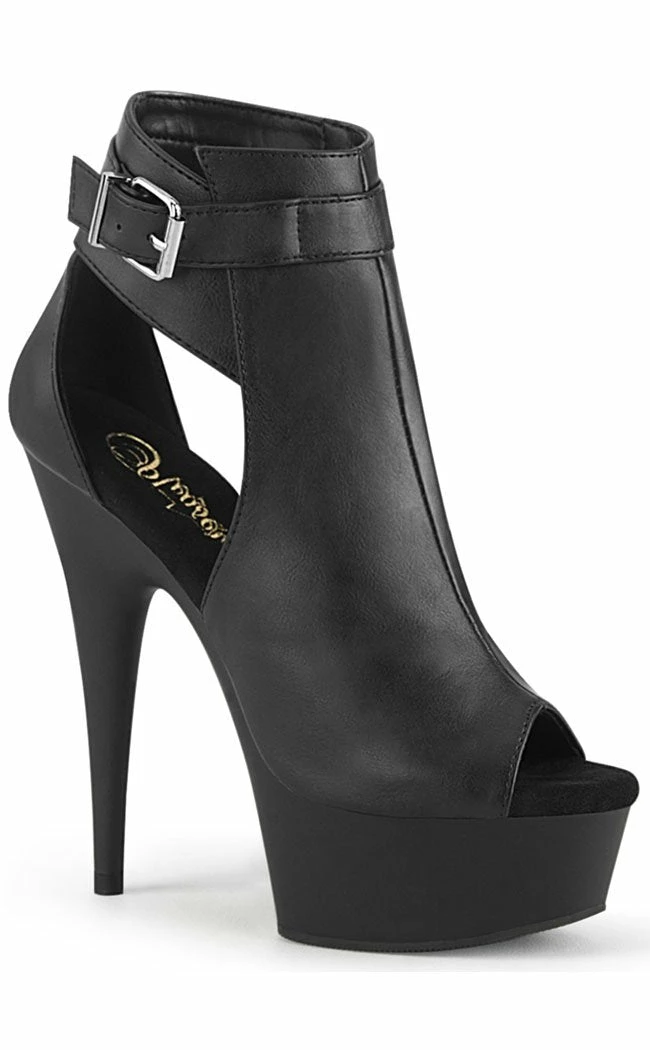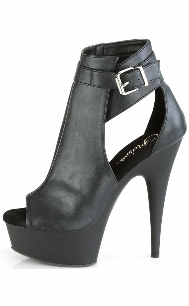 6″” (152mm) Heel, 1 3/4″” (45mm)Β platform peep toe heels.Β Ankle strap closure and cutout feature.