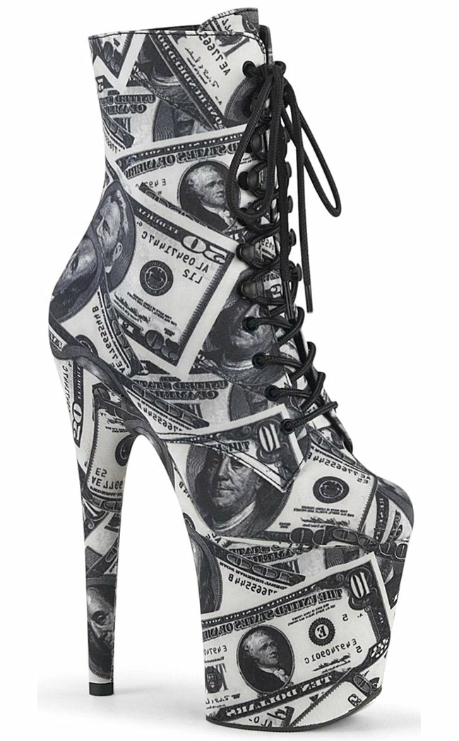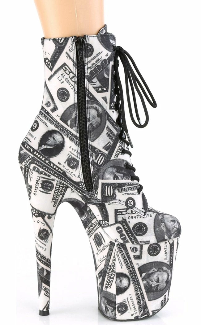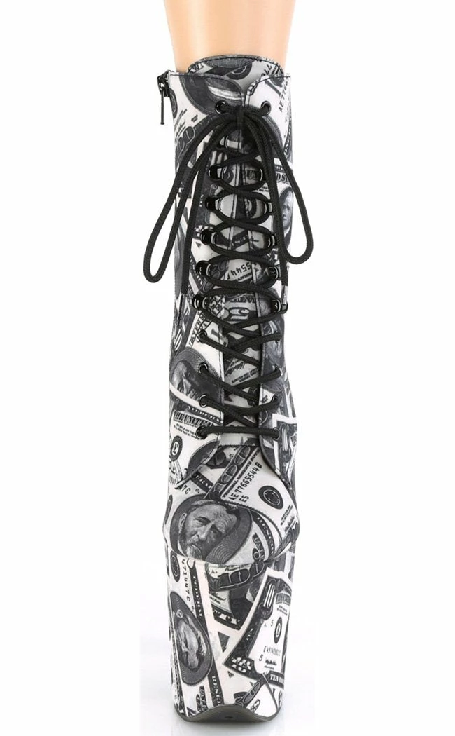 8″ (200mm) Heel, 4″ (100mm) platform boots covered in a print of US bank notes.Β Side zip closure.
