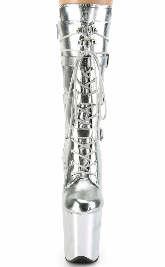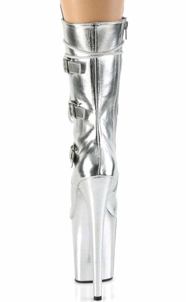 8″ (200mm) heel, 4″ (100mm) platform lace-up front mid calf boot with buckles, inner zip closure.